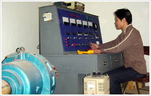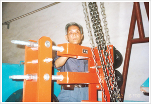 節(jié)能制動器創(chuàng)始人張家政先生(左一)在北京起重運(yùn)輸機(jī)械研究所實(shí)驗臺上進(jìn)行檢測